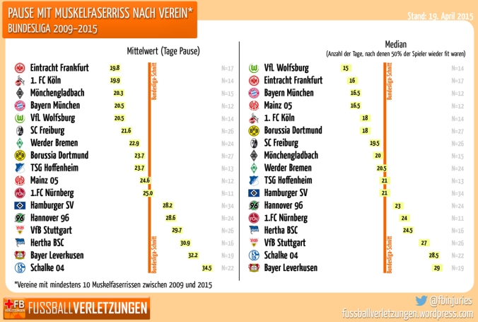 Wir schauen uns das mal exemplarisch bei Muskelfaserissen an. Ganz einfach deswegen, weil dies die mit Abstand häufigste Verletzung im Fußball ist. Und siehe da: im Ligavergleich liegen Müller-Wohlfahrt und sein Team zumindest bei der Genesungszeit bei Muskelfaserissen vorne mit dabei: