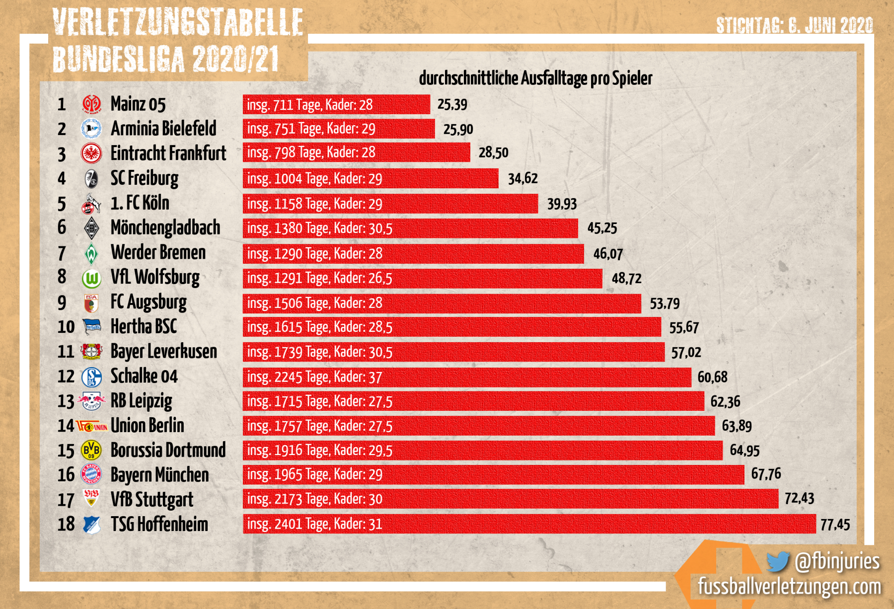 Die Saison ist vorbei, Zeit einen Blick darauf zu werfen, welche Teams in dieser Saison von Verletzungen gebeutelt und welche verschont wurden. So viel vornweg: Nur einer der Absteiger kann die Schuld (auch) auf Verletzungen schieben. Die komplette Verletzungstabelle:
